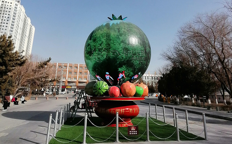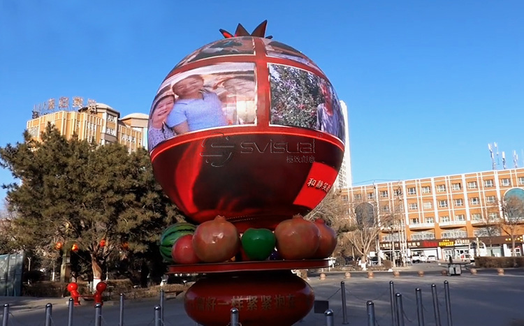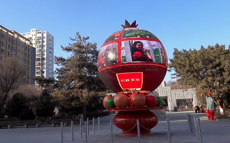 自2019年國慶閱兵新疆彩車“石榴屏”閃耀天安門之后,“石榴屏”就風(fēng)靡天山南北。和靜縣“石榴屏”,是一顆4米直徑的P5戶外LED球形屏+石榴花組成,底座上赫然刻寫著習(xí)近平主席在新疆考察時(shí)的金句 “各民族要像石榴籽一樣緊緊擁抱在一起”。